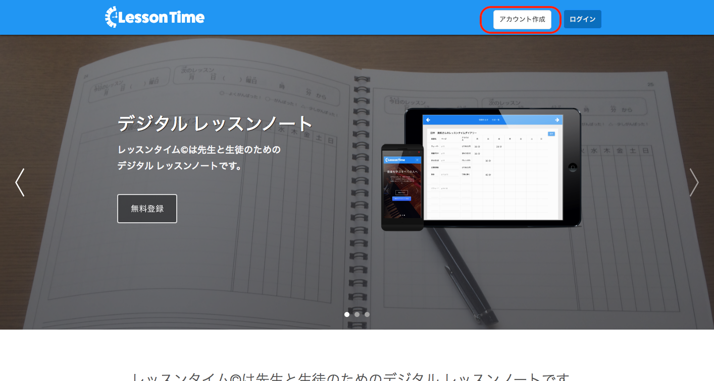 レッスンタイムのトップページ (https://lesson-time.com/) の右上にある「アカウント作成」ボタンをクリックします。